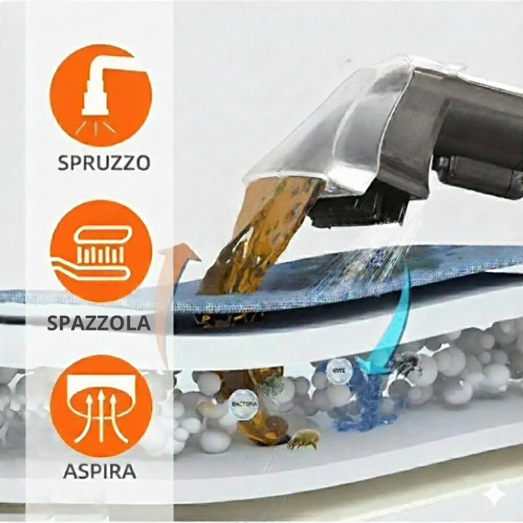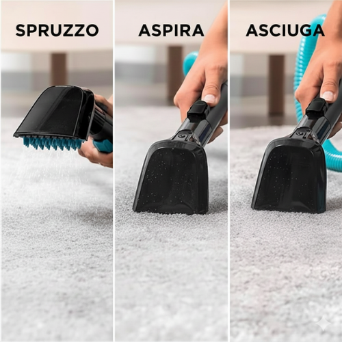 Il getto spray distribuisce il liquido in modo perfetto, la spazzola stacca anche lo sporco più difficile e l’aspirazione rimuove l’acqua sporca lasciando il tessuto asciutto pronto all’ uso.